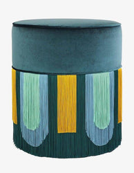 -  Su Yeşili Kadife Kumaşlı Çok Renkli Hareketli Püsküllü Yuvarlak Puf